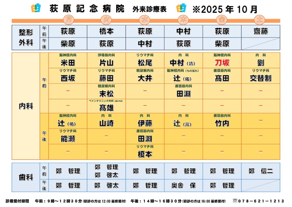 2025年10月10日より 以下の表の通り外来診療担当医師変更となります。